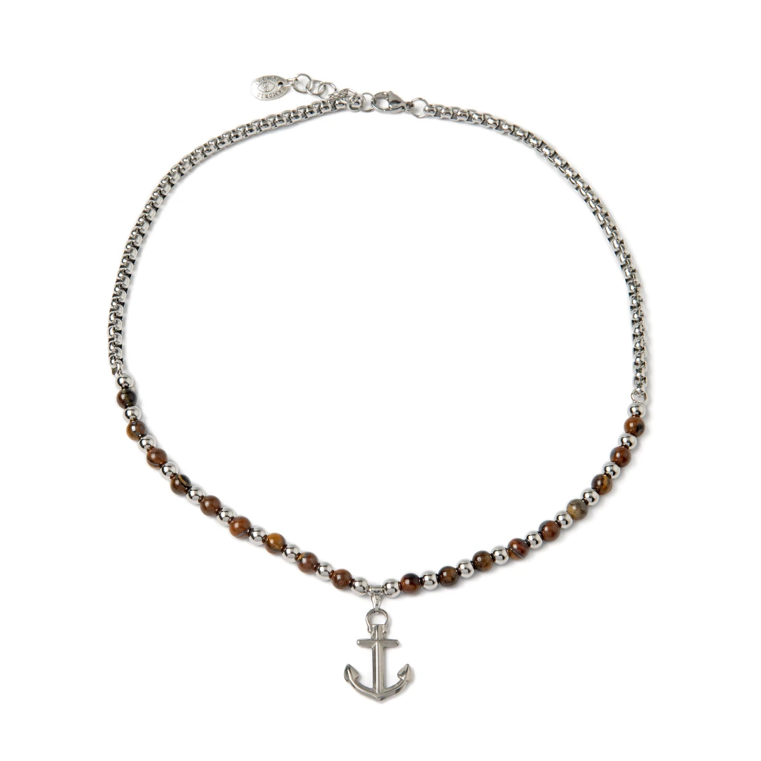 BASIC – COLLANA A CATENA QUADRA IN ACCIAIO CON GRANI OCCHI DI GATTO E ANCORA
